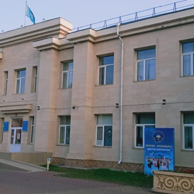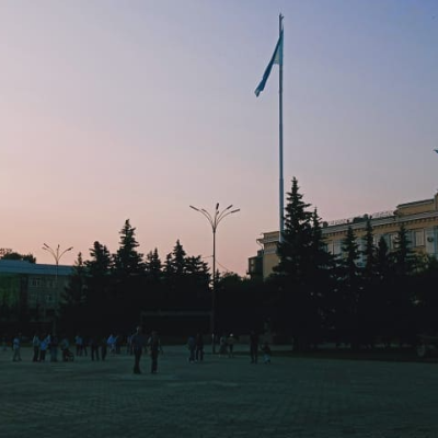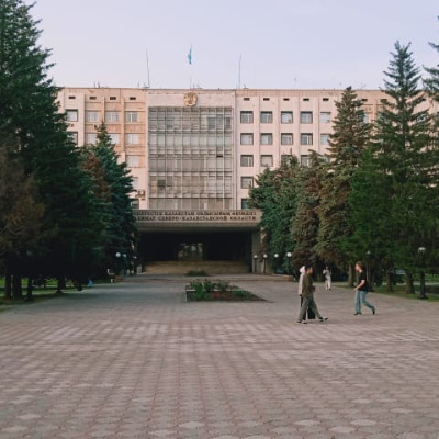 In front of the regional akimat (administration building), you can see the flag of Kazakhstan flying proudly on a tall flagpole.