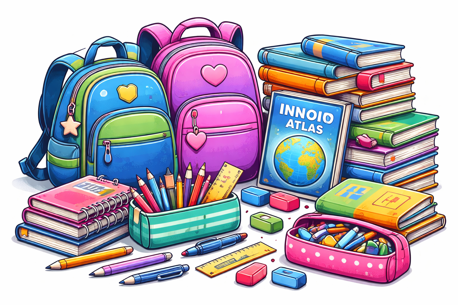 Pencil case, notebook, eraser, ruler, pen, pencil, pencil sharpener, atlas, schoolbag, pencil case, book.